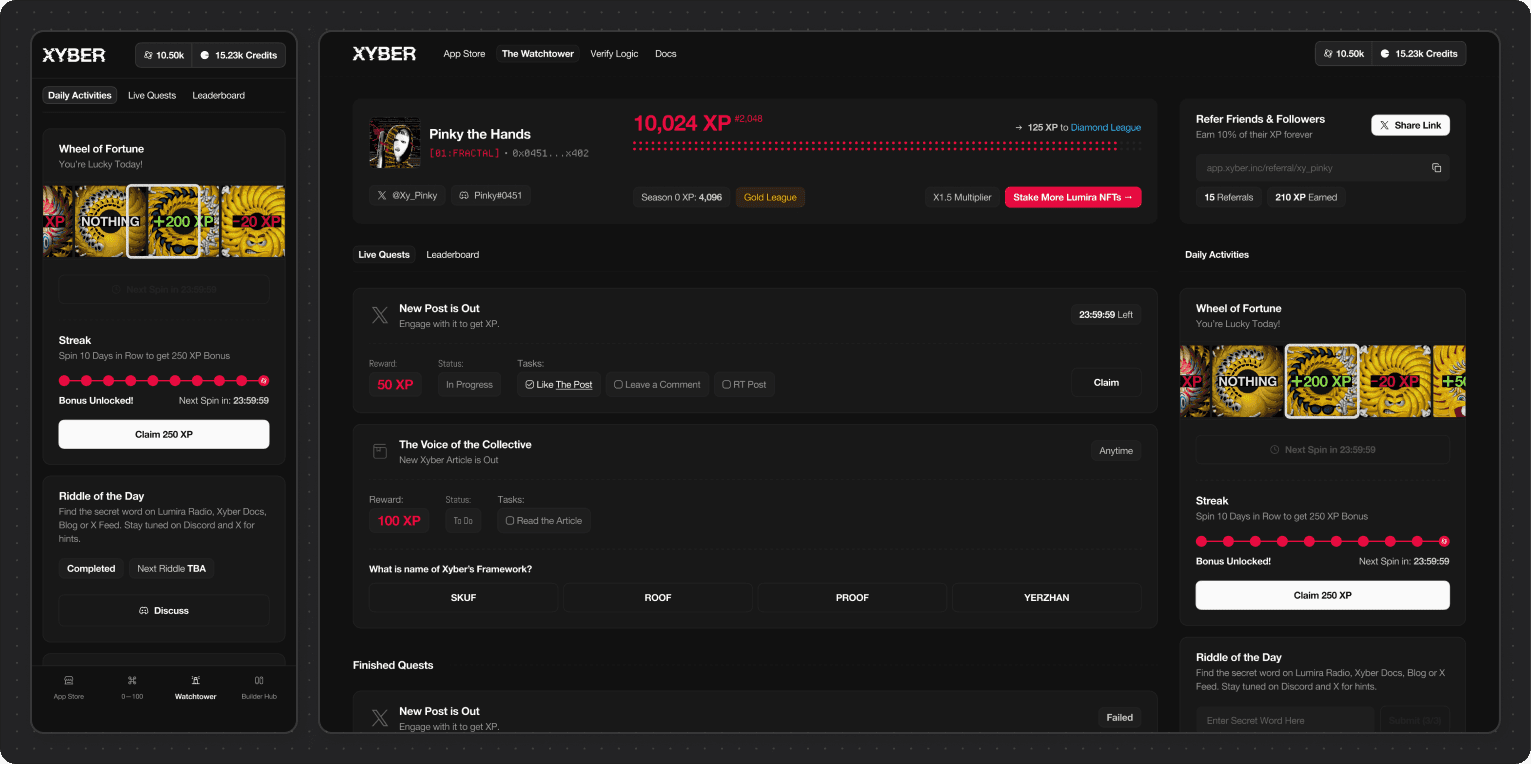 Varied quest system alongside daily retention mechanics: streaks, a wheel of fortune, riddles, live quests tied to real platform activity. Users earned XP, climbed leaderboards, and unlocked rewards. 25k returning users proved it worked.