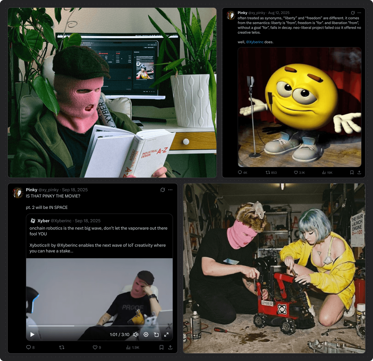 To get there, we needed a face. Pinky, a masked, mildly unhinged character who quickly became beloved. His appeal wasn't polish. It was realness: vague posting, product leaks, and direct unfiltered communication with the community. People didn't just follow Pinky, but waited for him. And every interaction was a signal: what landed, what didn't, what the community actually wanted next.